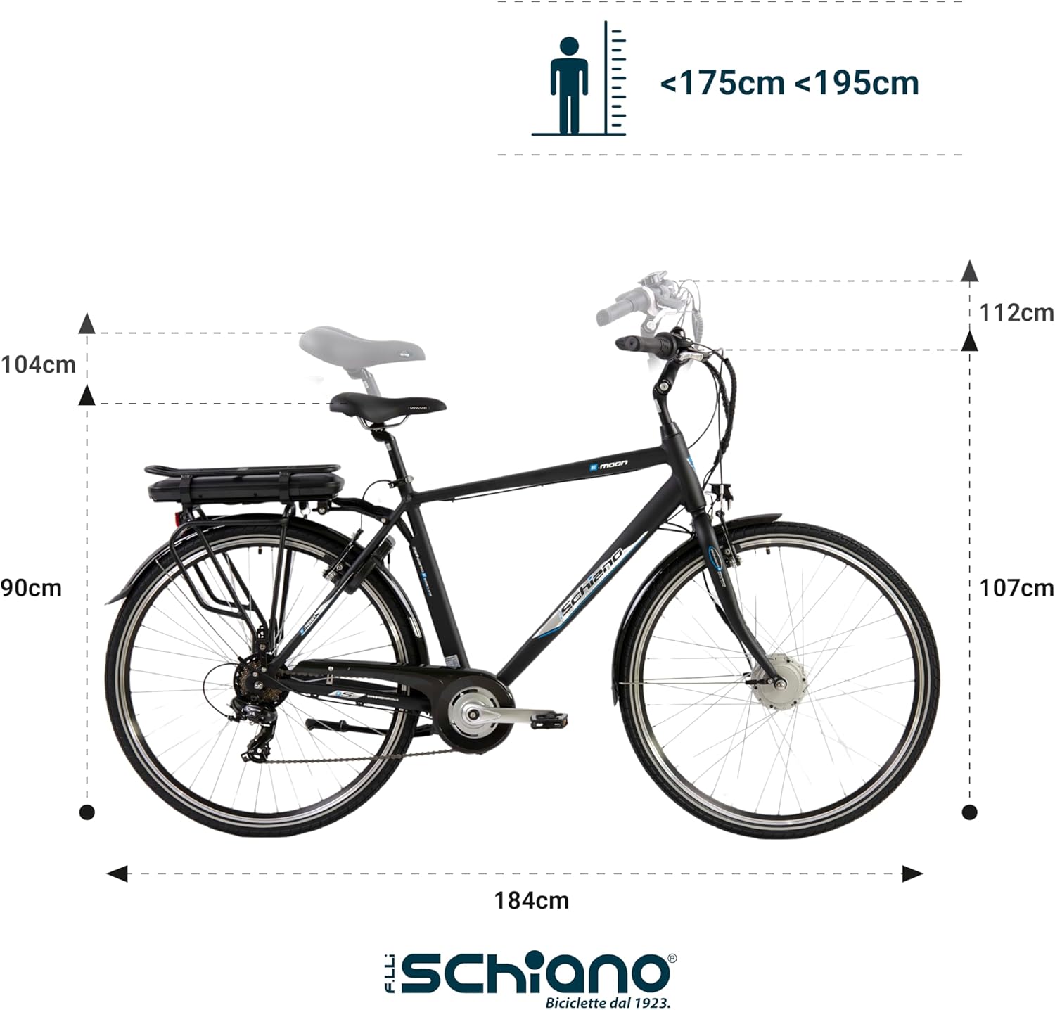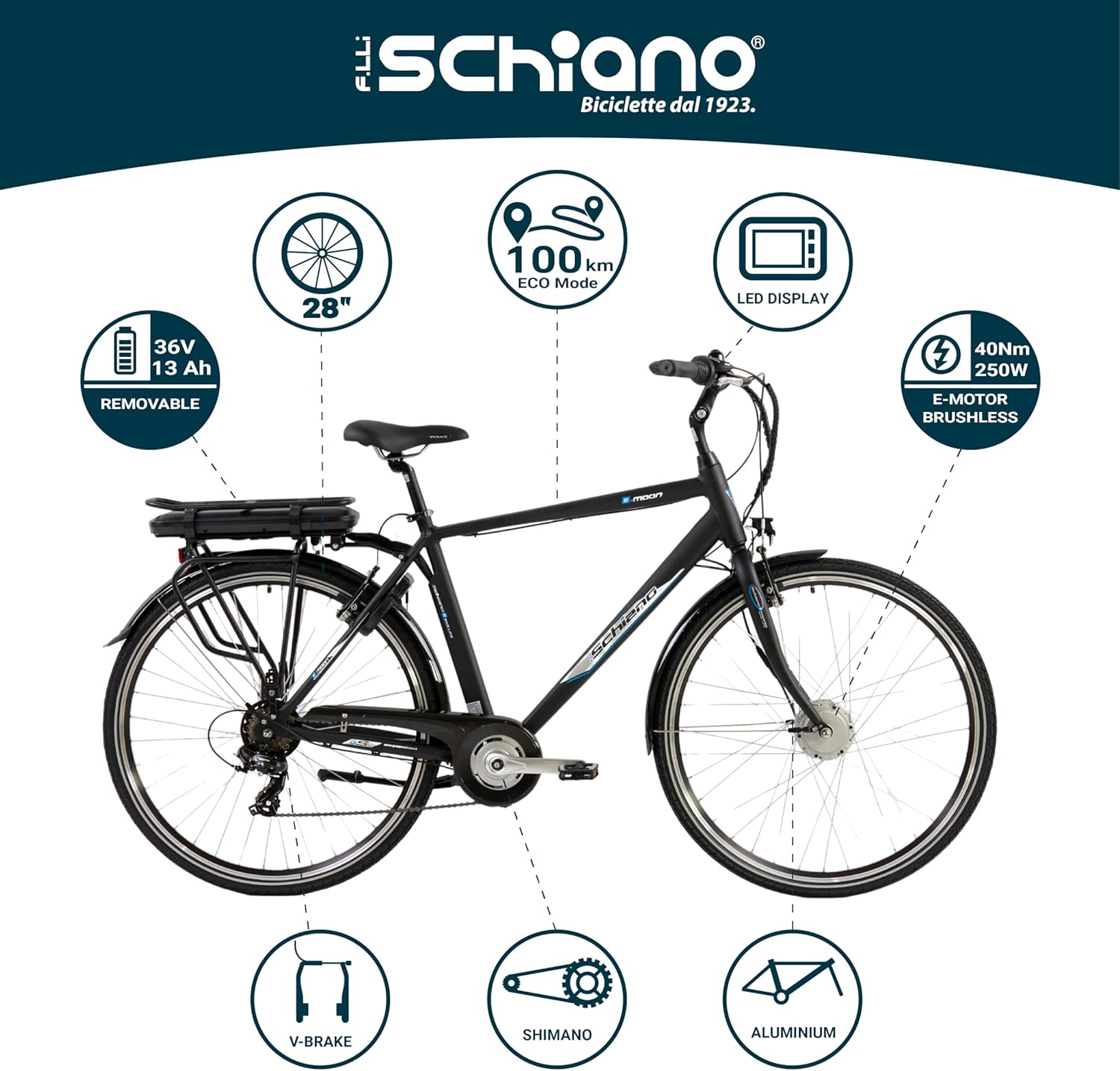 F.LLI Schiano E-Moon, E Bike für die Stadt 28 Zoll, 36V 13Ah Abnehmbarer Akku, Motor 250W 40Nm, City Ebike für Herren